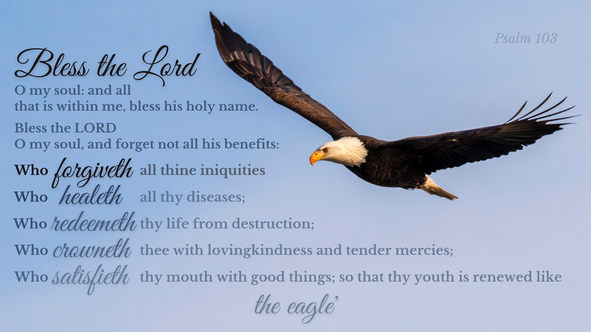 A Psalm of David. Bless the LORD, O my soul: and all that is within me, bless his holy name. Bless the LORD, O my soul, and forget not all his benefits: Who forgiveth all thine iniquities; who healeth all thy diseases; Who redeemeth thy life from destruction; who crowneth thee with lovingkindness and tender mercies; Who satisfieth thy mouth with good things; so that thy youth is renewed like the eagle'.