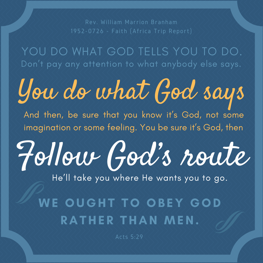 You do what God tells you to do. Don’t pay any attention to what anybody else says; you do what God says. And then, be sure that you know it’s God, not some imagination or some feeling. You be sure it’s God, then follow God’s route. He’ll take you where He wants you to go.